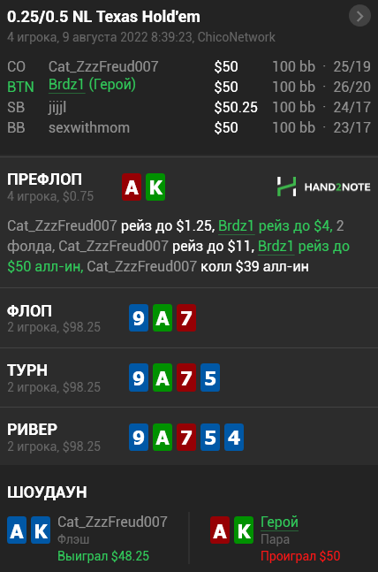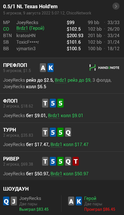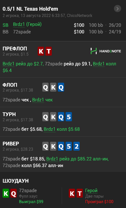 Вкину сюда, чтобы максимально прочувствовать стыд за бездарнейший розыгрыш года и думать перед тем как такое исполнять. Бля, у меня какое-то абсолютное неумение блефовать, хотелось сдохнуть на шоудауне. А когда еще раз посмотрел линию оппа после раздачи и подумал, куда я вообще блефую и как узко репаю... Мне до сих пор физически больно от этой раздачи