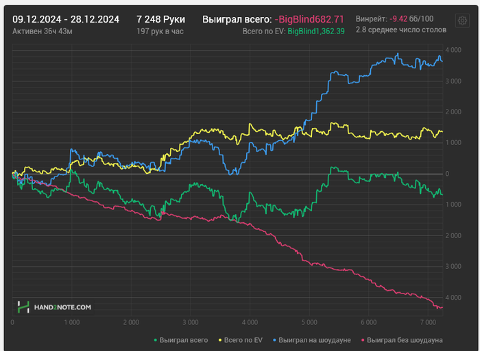 Но ща есть повод прям покерный, прям не стыдно нафлудить. Короче, я набрался смелости сделать годовой отчетик за 2024. И оказалось, внезапно, что я был в нем плюсовым игроком. С рейкбеком, конечно, но не пофиг ли? Целых $1,7k наковырял. Это, я считаю, звучит гордо.