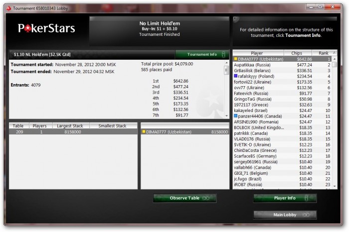 PokerStars - $3.19+$0.31|2000/4000 Ante 400 NL - Holdem - 8 players