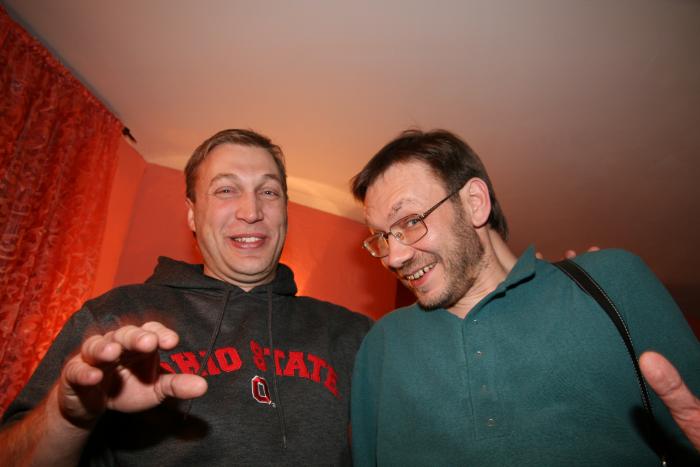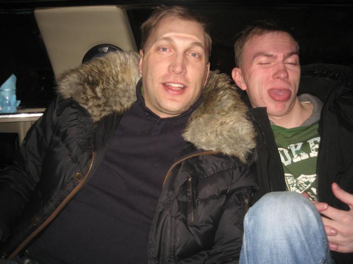 27 января (часть 2) продолжаем В гостинице я проснулся от стука неизвестного, двое других (Комбат и Ювик) мирно посапывали, не проявляя никаких действий. В дверях стоял позитивно настроенный чувак, мы в очередной раз обменялись паролями и на дисплее высветилось имя ещё одного реального пацана форума Руслан (ака Бангерт). Посмотрев на меня и тех педиков, которые лежали на кроватях, он понял, что переговоры без пива не продолжаться. Вуа-ля и через 5 минут мы уже пили за знакомство. Через несколько часов было решено выдвигаться на Боярски-Пати, которое было запланировано на этот вечер. И тут произошла череда событий, которая ставит под сомнение теорию "а если кто ещё медленнее эстонцев?". Практика показала есть! И их два! В 17:00 мы начала собираться на пати, Комбат начал отдавать приказы типа вставайте и заказывайте такси. Через минут 40 наконец-то Ювик собрался заказать такси, но так как он это никогда наверное не делал, то стал узнавать, что нужно говорить или что нужно отвечать, если тебя спрашивают а где вы находитесь. Судя по всему Ювик так и не понял где он находился вообще все эти 3 дня. Короче мотор был заказан буквально за час. Всего-то ничего! Выехали мы где-то 19:20(сбор был в 19:00), и что ещё удивительно мы приехали первыми! Ай да Москва, ай да город больших надежд! В течение часа подвалил весь остальной бомонд московского разврата (Андрюха ака"Angier",Борис ака"цЮПАНКНЦ", Тим ака"Tainer",Серёга ака"-Sava-", Толик ака"Wintyra").Поели, попили, кальян покурили и созрела правильная мысль посмотреть город на лимузине, за что отдельное спасибо винтяре, так как в Москве стояли сильные морозы и для приезжих посмотреть Москву было просто нереально. Веселье было в самом разгаре, по дороге заехали в магазин, затарились и поехали в какой-то бар, где в это время занимались, не знаю правда чем, Макс Катц и Ярослав ака "Sleffa". Там выпили самбуки, которую я никогда не употреблял до этого, ну очень прикольная штука! Дальше поехали смотреть ночную Москву. Очень красиво! Компания оказалась у нас супер! Мы пели и пили, а также кто не умел петь орали, короче время провели очень классно. Ради этого стоит приезжать в Москву, чтобы лично увидеть тех, кто пишет на форуме.