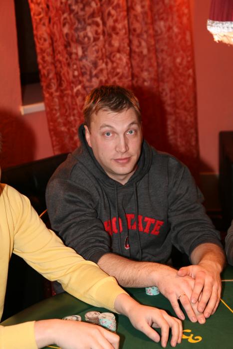 Моей целью на этот турнир конечно была не победа, а именно знакомство и общение с форумчанами, а так как я очень скромный, поэтому я начал сразу знакомиться с соседями по столу. Со мной сидели за столом: Ermolov, Griflin, Olka_SPB, MadRevolver, Sleffa и несколько др.хороших парней, ники которых мне не удалось узнать. Через некоторое время наш стол стал 11мах, подсадили KAIRRa. Для меня турнир начался так сказать не очень, в первых 20-ти раздачах 3-ка зашла мне раз 12 и раз пара 3-ек. Постепенно мой стек уменьшился до половины, на самом деле я всем сразу сказал, что мне комфортно играть коротким стеком, чем я сразу и воспользовался удвоившись перед самым перерывом, запушив с 66 против АК(сет он и в Африке сет). В перерыве лично познакомился с Серёгой ака"Gipsy", приятный , рассудительный человек, поболтали о том о сём, пожелали друг другу удачи и продолжили играть турнир. Постепенно стек у меня поднялся до 23К, карта заходила и аллины от коротышей выигрывал, правда один проиграл AJ<KJ. Одна раздача очень понравилась, которую я сыграл с Griflinом. Он сумел всё-таки мои J10 переблефовать своими Q10 , хотя у обоих ничего не было. Респект тебе, не удивлён что ты оказался на финалке. А вылетел я банально, запушив 22 и меня принял Енот с АА, и хотя на тёрне у меня уже было стрит- и флешдро, но чуда не случилось. После этого я продолжил общаться с другими участниками турнира, т.е основная цель поездки была выполнена на 100%! Познакомился с Ваней Демидовым и Ликой (не знаю ещё Демидовой или нет), потрепались с Славиком ака"InspektorPO" насчёт нашего совместного даунстрика, накачали друг друга аурой. Интересный момент Енот сидел довольно тайтово и тут пихнул весь свой не маленький стек. Ваня заколлировал c AQ, но Енот показал КК и чуда не случилось. Так вот, что мне больше всего понравилось, что Ваня признался в своей ошибке при всех. Респект, вот что отличает профессионала от нас. На этой хорошей ноте хотелось бы закончить свой краткий отчёт о своей поездке на турнир джипситим в Москве. Надеюсь это наша непоследняя встреча, слышал от многих пожелания встретиться летом на чистом воздухе где-то в Подмосковье. Я всеми руками и ногами ЗААААААААААААААА!