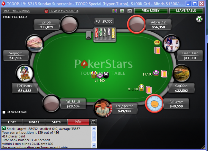 очередное УГ( Играл ТКУП-Суперсоник. налакбоксил чуток, набил стек и начался бабл. Вот такой попался стол: средний стек на момент скриншота 33-35к. в начале нервы немного попртила аткая раздача. PokerStars No-Limit Hold'em, 215 Tournament, 1500/3000 Blinds 600 Ante (9 handed) - PokerStars Converter Tool from http://ru.flopturnriver.com