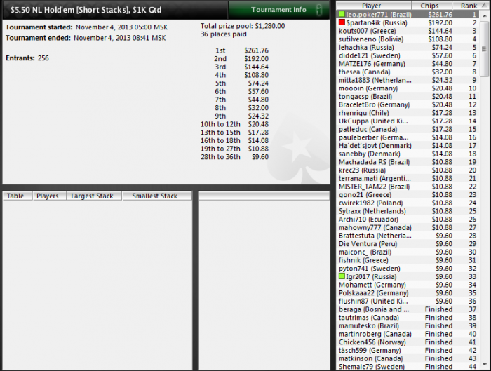 Poker Stars, $5 Buy-in (1,000/2,000 blinds, 200 ante) No Limit Hold'em Tournament, 8 Players