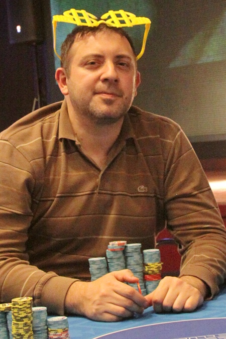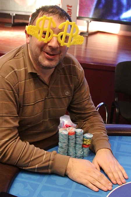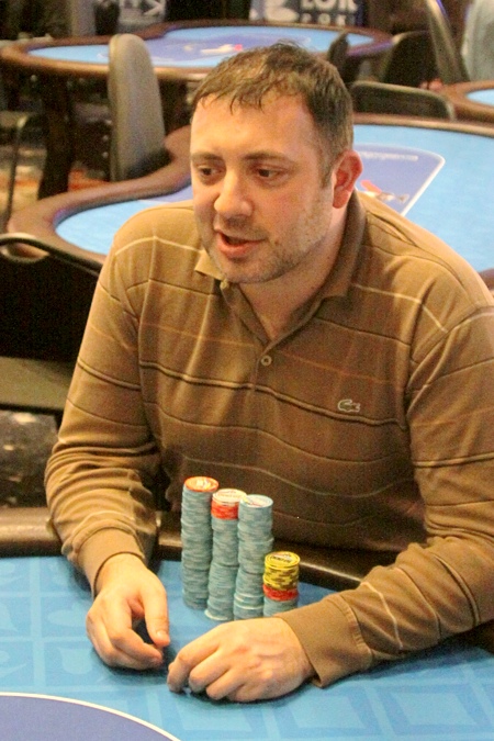 "У меня 253 тысячи," - объявил Беринбейн. Подошел Крашенников, изучил его фишки: "Я же тебе говорил, что у меня будет средний стек! - Потом пересчитал свои фишки... - Леш-Леш, я тебя обманул - даже больше среднего, теперь стало 608 тысяч..." Кстати, средний стек на четверых - 465К.