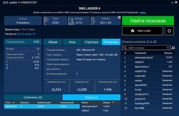 Билет за 22 евро на МПН оставался после слитых без ИТМ турниров и за 109 в частности. Занёс там от ГТ как-то давненько пачку билетов. Ну вот и остался этот один несчастный. И кааак попёрло. За час с небольшим 5 или 6 начальных было. И тут раздали КК. Я рейз, там пуш, колл. Вижу