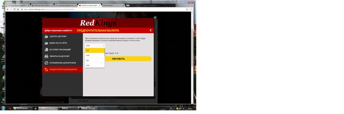 1. Поменять валюту можно теперь и не заходя в казино. Зайдите на покерный сайт, нажмите на кнопку депозита, выскочит окно, где в меню будет строка Preferred Currency / Предпочтительная валюта - нажимайте на нее. После того, как поменяете валюту на евро, можете проверить, что все в порядке. Для этого вернитесь в свой счет на сайте RedKings и проверьте, чтобы везде были евро:
