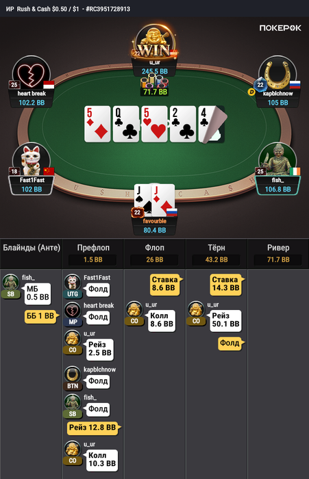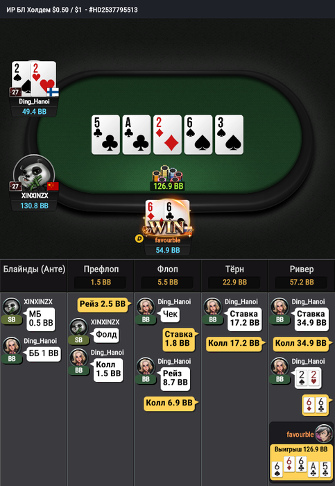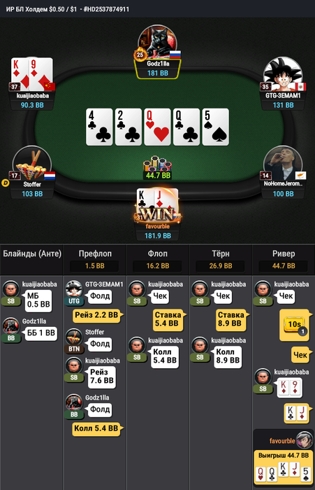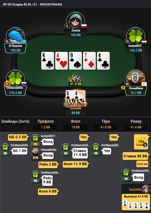 Тут тоже вроде нормально. Ривер у меня рука анблочит все фолды, вельюбечу я условно от АК. Его кол на префлопе удивил, давно не видел такой линии.