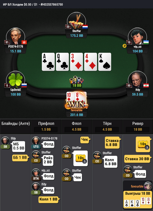 Да редкий оригинал - это оппонент. Вышло все из ренжа 4бет пота - А, К , 10, а он блефует. Люблю таких персонажей.