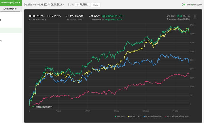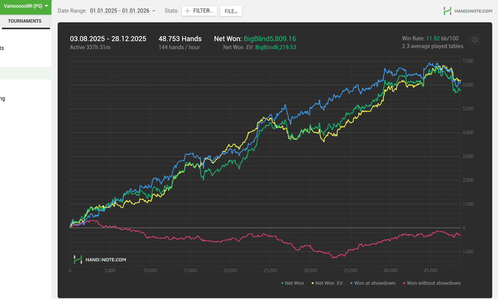 Полную картину показать не смогу, так как текущая база у меня с августа, но до этого было где то 14бб/100. В сентябре случился провал, я отыграла 4.6бб/100. А целом за год вышло около 13бб/100.