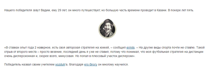 На главной сайта уже давно действует правило пяти секунд, но сегодня заметил знакомый ник и решил, узнаю че там к чему, а потом схожу помою руки с мылом. И что же я увидел - читатель блога начинал со стратегий на хоккей, но читал блог, усердно ставил плюсики, не шуточки тут шутил и не подъебчики постил, а знания впитывал и смотрите чего добился. Готовый сценарий для фильма и хороший пример всем остальным.