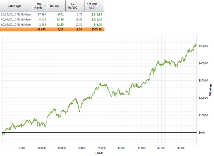 Графика до к сожалению не сохранилось т.к. сносил базу,но был я думаю как у большинства кто обращался за помощью,100-200к рук с винрейтом 1бб/100 и красной под углом 45 градусов,вот график после прохождения курса,видно плохо,так что скажу: NL5,винрейт 6bb/100 по факту и 8bb/100 по EV