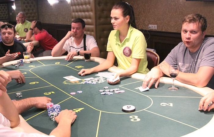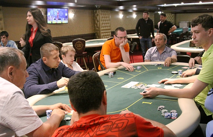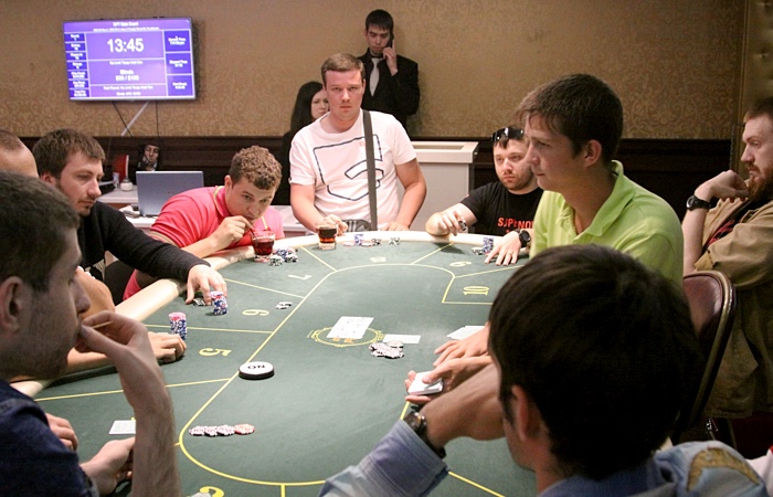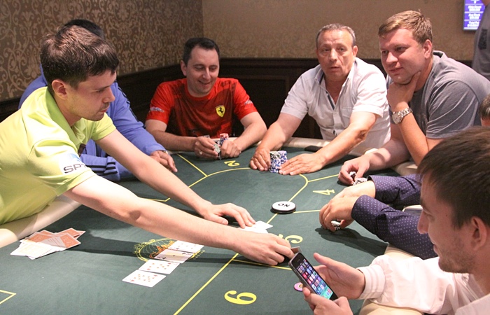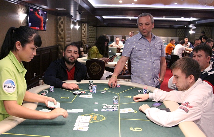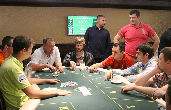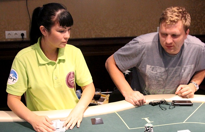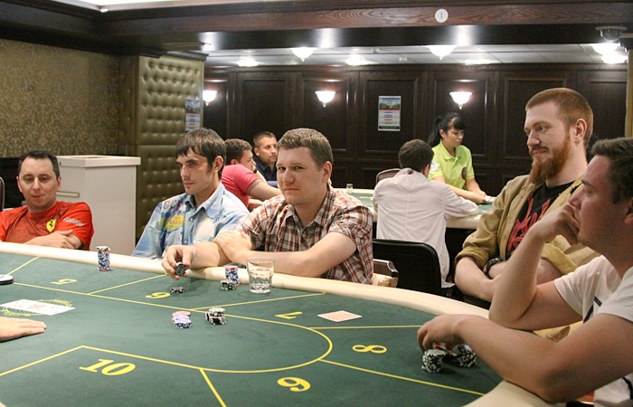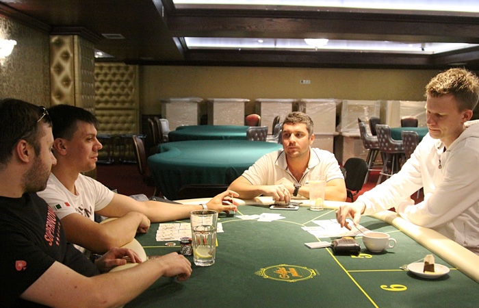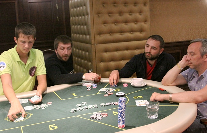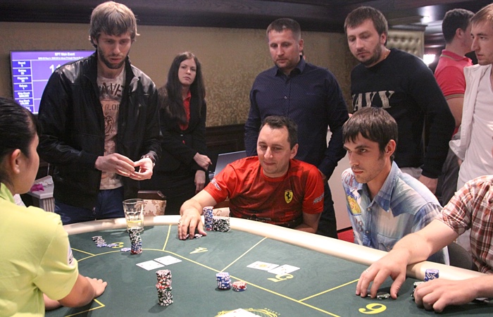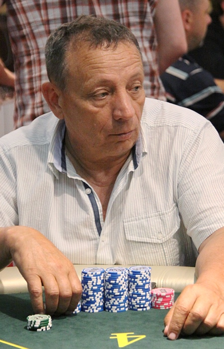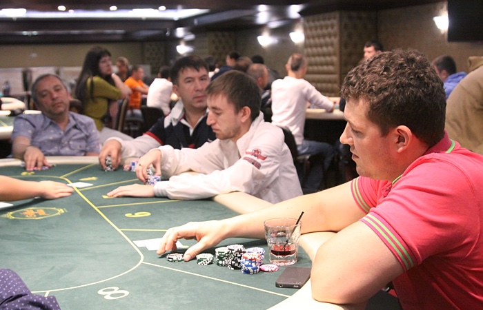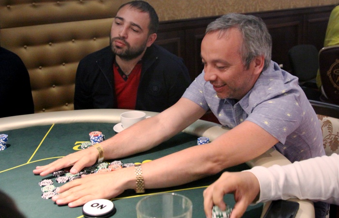 Продолжает наращивать стек Анатолий Дробышев - ветеран играет чуть ли не каждую раздачу, еле успевая сортировать выигранные фишки.