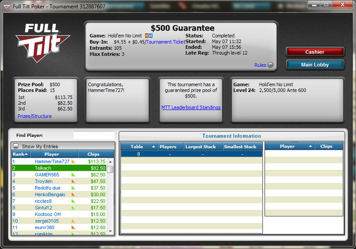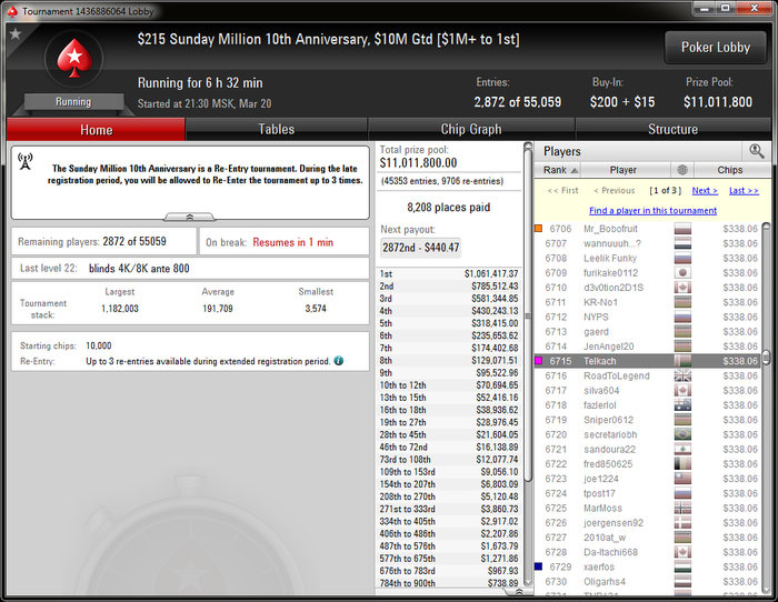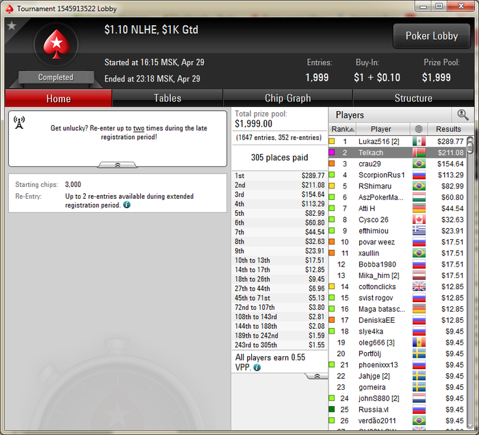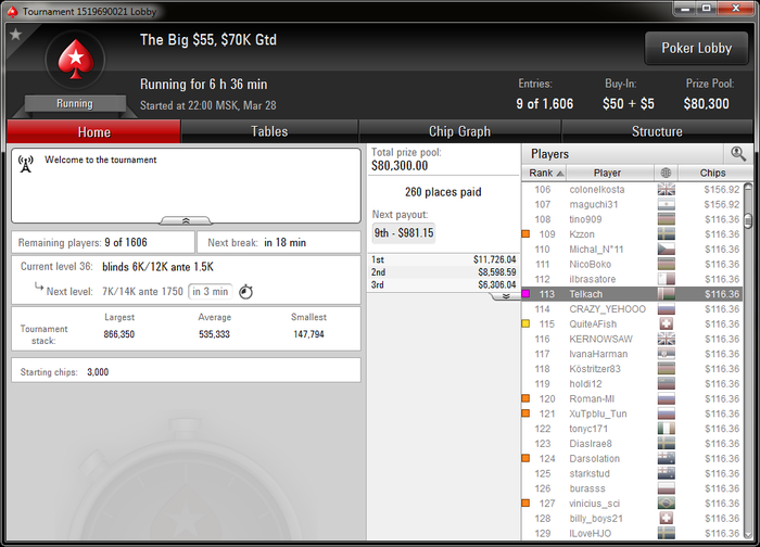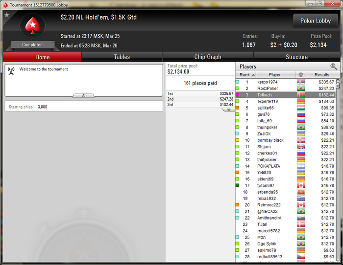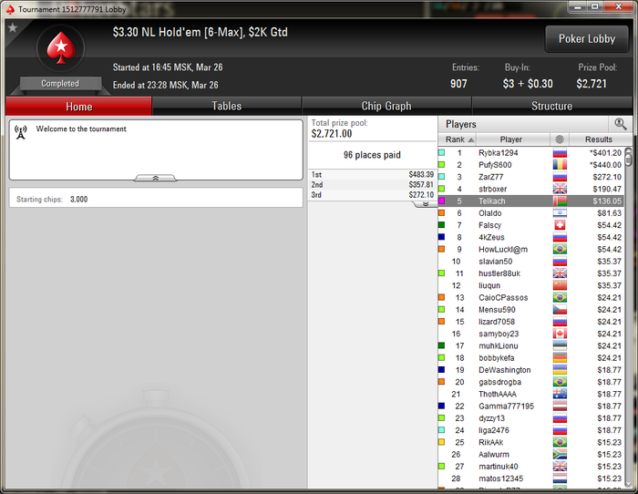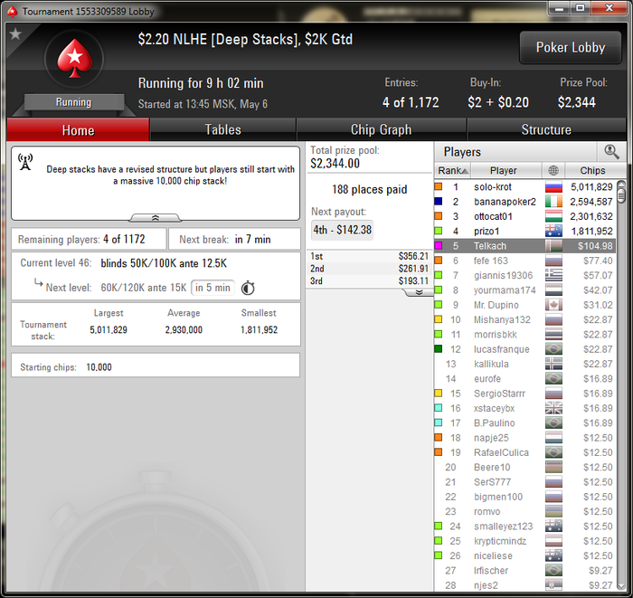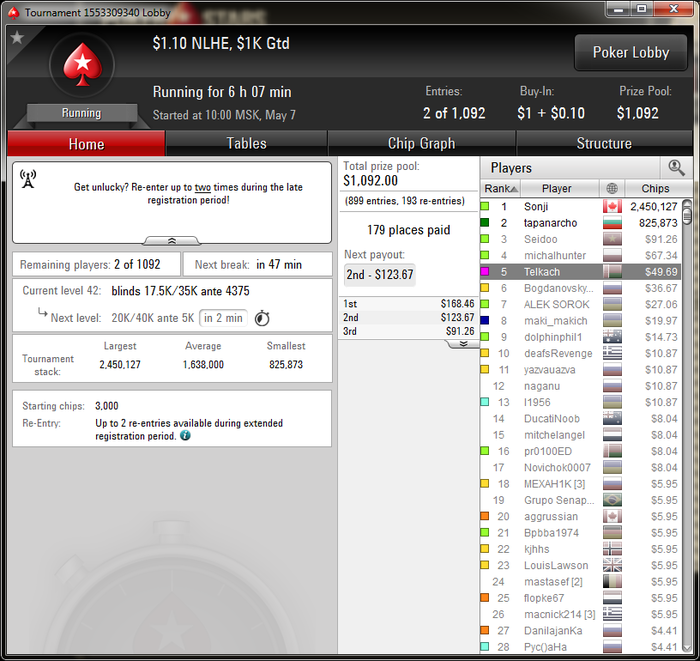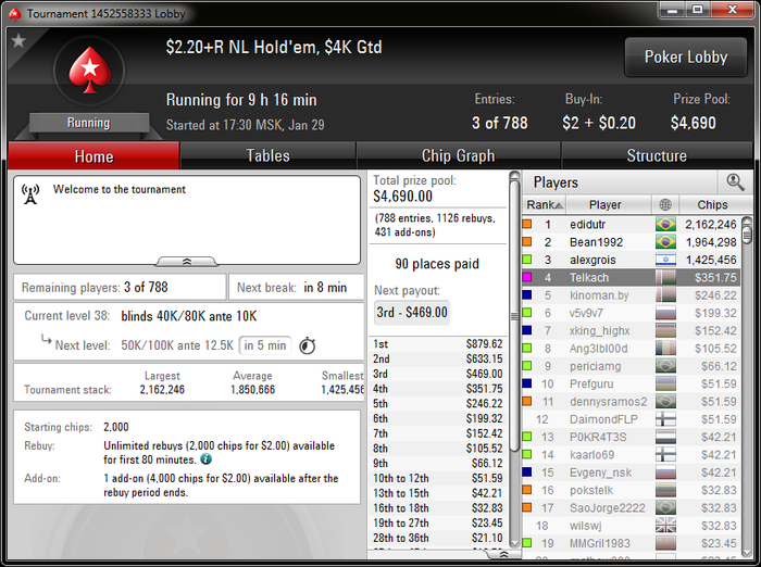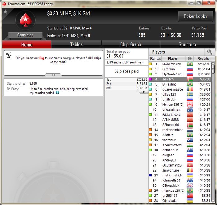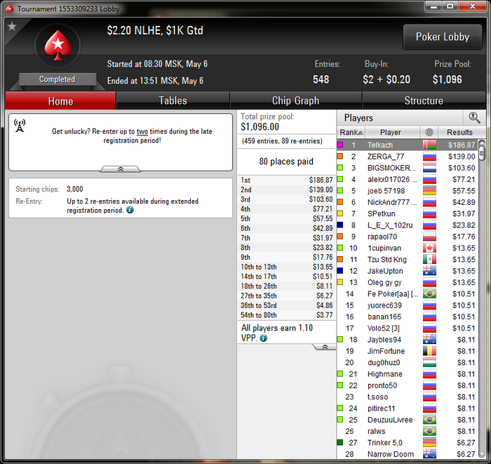 Не пускают на "пьедестал" в этом ребайнике в который раз, то 5-й вылетаю, то 4-й. В последнем особенно обидную не втащил с АА против 33 префлоп, за супер доминирующий чип-стэк - макнули мордой в кал, выложив на флоп троечку )) Правда удалось ещё чуток удвоиться и пересидеть одного бойца - "односельчанина" )))