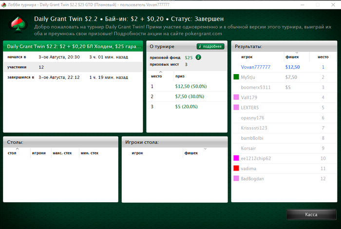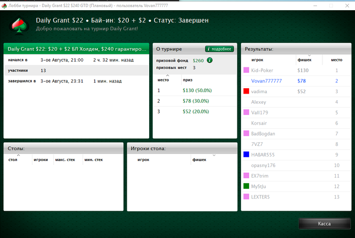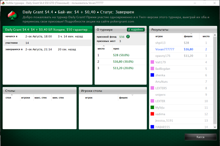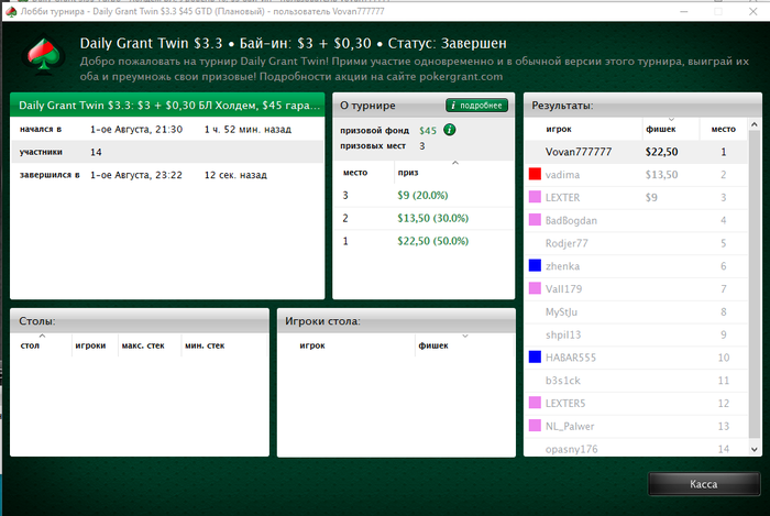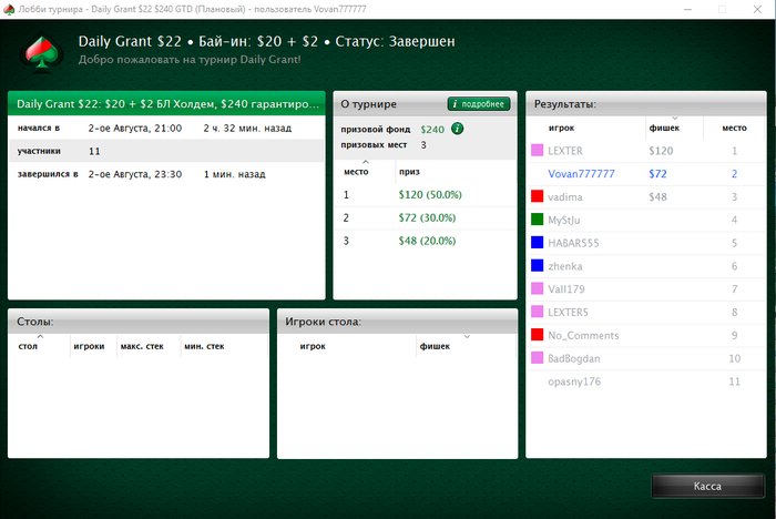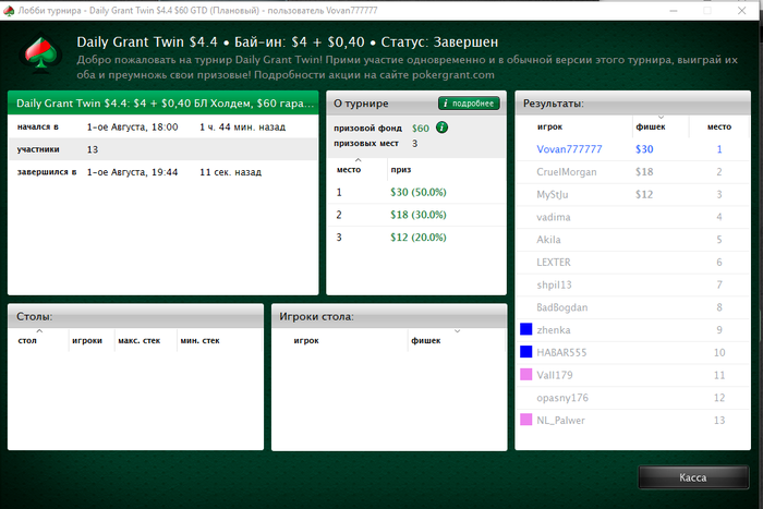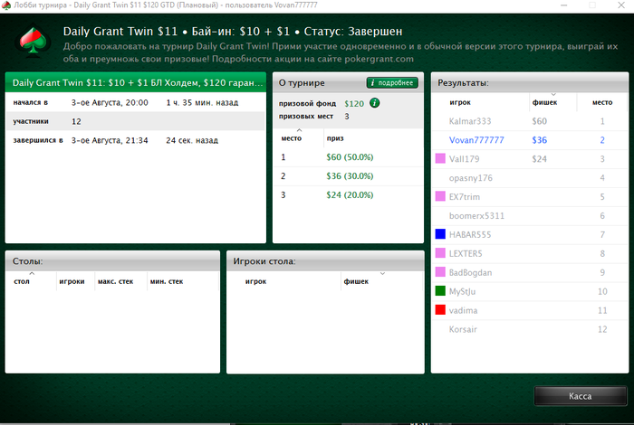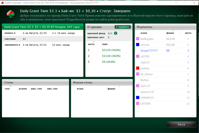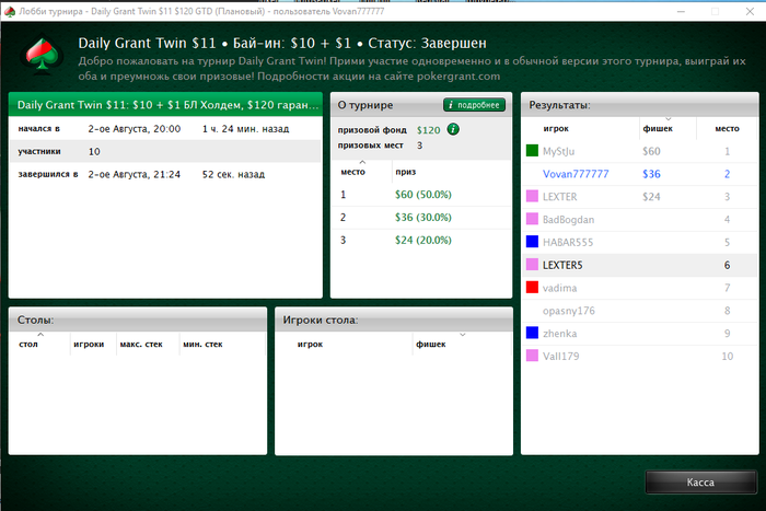 А в самом гранте я вас норм покошмарила... В итоге сидела то с 1, то со 2 стеком... И с Богданом в замес вошла на ББ на его мин рейз с то ли 8-10s, то-ли с 9-10s... В итоге на флопе ловлю 2 пары(топ и среднюю) - ставка в банк - приличный такой баррель... А он пушит - принимаю - в 10 попал и с вальтом кикером... И ривер как всегда валет...