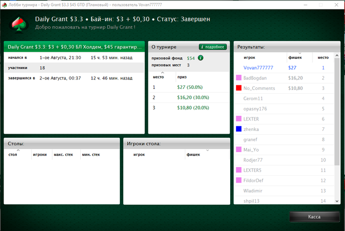С 1-го августа вернулся с кеша в мтт. Соскучился... Заключил соглашение по бэкингу и с микролимитов перекинуло меня на лимит с 2 до 22. Еще не знаю, что мне принесет августовская дистанция, но 1й день вышел +35. Были и 1е места.