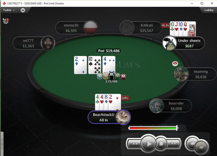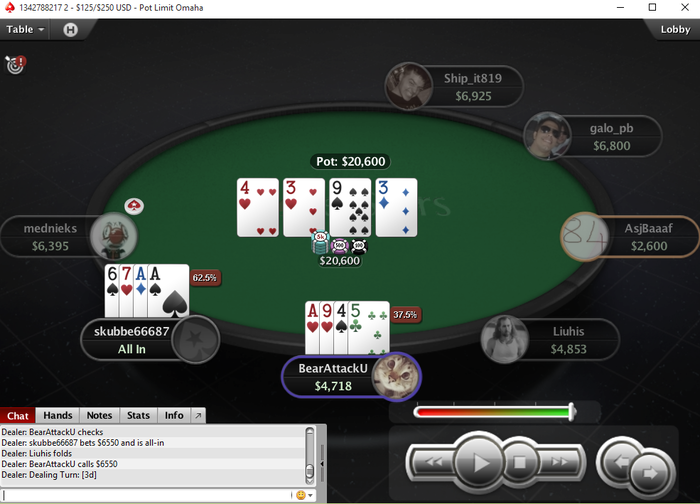 PokerStars - $30+$3|400/800 PL Hi - Omaha Hi - 6 playersHand converted by PokerTracker 4Hero (SB): 9.34 BBBB: 21.06 BB (VPIP: 36.36, PFR: 27.27, 3Bet Preflop: 0.00, Hands: 12)