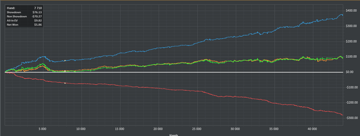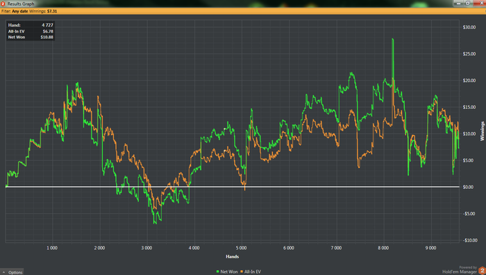 Решил вот поглядеть что у меня с графиком. И пришел к выводу что топчусь на месте. Сдавали конечно не самым лучшим образом - но это не оправдание на таких низких лимитах. Из прогресса могу отметить только психологию. Тебе переходы на нл5, да и вообще игра на этом лимите не вызывает эмоций. Спокойный рабочий настрой. В чем секрет (для меня лично это было открытием)? а ответ прост - миксовать столы лимитов. Тогда не зацикливаешься - и играть становиться проще. не придумываешь ерунды - т.к. столы рабочего лимита открыты и там уже все по накатанной. И просто переносишь свои игру на лимит выше. Думаю это приминимо вплоть до нл50-100