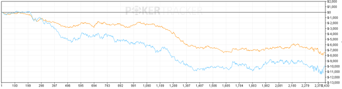 Во-первых, график в деньгах. Специально. По факту, примерно 10k и уплачено ими/нами рейком. Из них примерно 3/4 - 4/5 по EV ими. Это не дистанции, не сэмплы - чтобы выносить точные оценки но тренд.