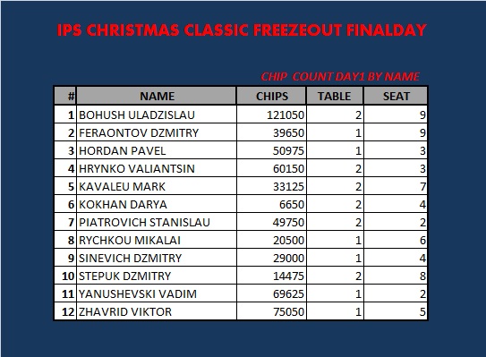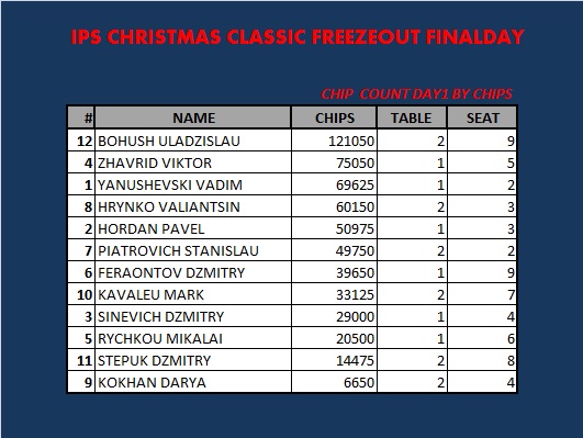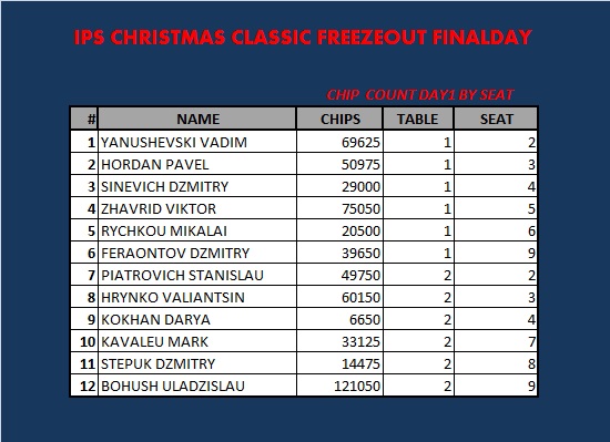 Закончился IPS CHRISTMAS CLASSIC FREEZEOUT DAY 1. В игре осталось 12 участников. Продолжение завтра в 13.00 с уровня 500/1000 анте 100. Поздняя регистрация еще будет доступна в течении одного уровня.