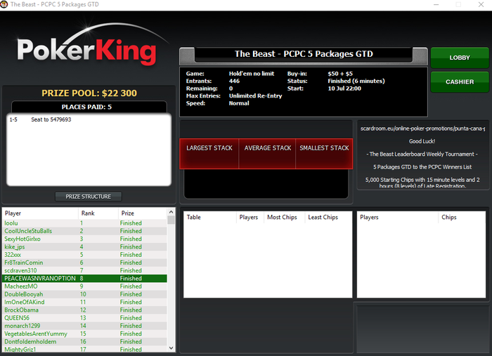 Если Вы выиграете билет (стоимость билета $12 500), есть возможность выбора из нескольких вариантов. С одной стороны Вы можете выбрать 2 путевки на турнир Punta Cana и поехать туда с кем нибудь. Вы также можете поехать в Доминикану и продать другую путевку. Если вы не хотите ехать на Punta Cana, Вы можете получить $12 500 на свой баланс на PokerKing. По идее это средства на бай-ин турнира WSOP, но если у вас нет возможности или желания туда поехать, Вы свободны распоряжаться этими средствами как Вам угодно.