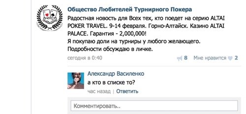 В Горный Алтай на несколько дней серии собирается прибыть президент ОЛТП Андрей Елисеев, причем не один, а вместе с командой лучших игроков Общества. Вы скажете, далековато из Питера, - но для них нет ничего невозможного. Ну и, конечно, вы обязательно столкнетесь с ними в сателлитах на APT - как в PokerStars Home Games, так и на LotosPoker. Их будет много, их практическую силу вы скоро почувствуете на себе. Только в официальной группе вКонтакте их почти две тысячи.