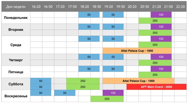 «Шаг 1». NL Hold'em. Бай-ин - 50 руб. Стек - 1,500. Уровни - 5 мин. Ребай неограничен, эдон после 6 уровня. Призы - билет на «Шаг 2», сдача - баббл-бою* «Шаг 2». NL Hold'em. Бай-ин - 250 руб. Стек - 2,000. Уровни - 5 мин. Ребай неограничен, эдон после 6 уровня. Призы - билет на «Шаг 3»**, сдача - баббл-бою «Шаг 2+». PL Omaha. Бай-ин - 150 руб. Стек - 2,000. Уровни - 5 мин. Ребай неограничен, эдон после 6 уровня. Призы - билет на «Шаг 3»***, сдача - баббл-бою «Шаг 3». NL Hold'em. Бай-ин - 1000 руб. Стек - 2,000. Уровни - 10 мин. Два ребая, эдон после 6 уровня. Призы - билет на Altai Palace Cup (10К), сдача - баббл-бою «Шаг 4». NL Hold'em. Бай-ин - 3000 руб. Стек - 3,000. Уровни - 10 мин. Два ребая, эдон после 6 уровня. Призы - билет на APT Main Event (30К), сдача - баббл-бою