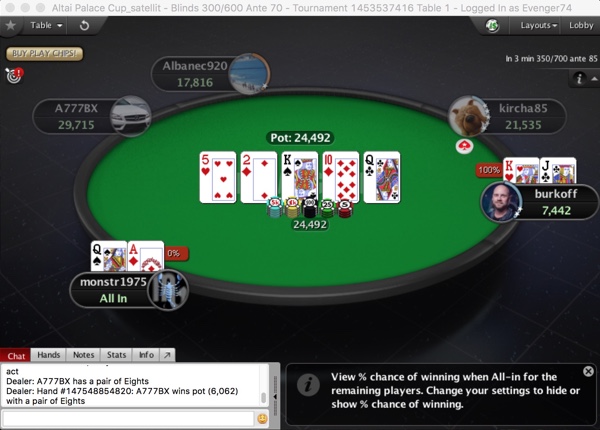 Только что завершился эпический баббл в сателлите на Altai Palace Cup - 5-max играли больше получаса, при этом чип-аутсайдер за столом менялся три раза! Даже в заключительной раздаче, определившей четырех обладателей билетов по 10,000 удача в префлоп олл-ине сопутствовала слабейшей руке: