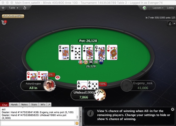 Еще более напряженным и продолжительным вышел баббл в сателлите на APT Main Event. Сперва в топ-4, а после харакири Даниила "Best301186" Шумилова, втроем между Павлом "Pasha42region" Кириенко, Степаном "UNdead1990" Середой и Евгением "Evgeny_nsk" Ольвинским... Инициатива несколько раз переходила из рук в руки, пока в решающем префлоп олл-ине не сошлись новосибирца и новокузнечанина. Флоп, казалось, убил всякую надежду, но... на терне у Паши вдруг мелькнул лучик надежды. "Эх, не та парка вышла", - сказал Кириенко, получив за труды билет в тот же самый сателлит на мэйн, что состоится через неделю.