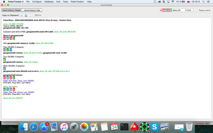 Но приходит очень интересный ривер. Эта ситуация мне показалась стандартной, так как по идее в диапозоне бб очень мало А4, по крайней мере большинство в 30бб должны лететь оллин на префлопе еще. Ну и плюс у меня какой-то блокер на А. Только я не учел что этот чувак вообще ниразу меня не трибетнул за все время впринципе, то есть там вполне могут быть и А4. Даже с учетом возможного наличия А4 вроде как околонулевая или слегка плюсовая(по фишкам)