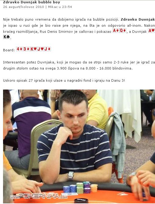 Nije trebalo puno vremena da dobijemo igrača na bubble poziciji. Zdravko Duvnjak je ispao u ruci gde je bio raise pre njega, na šta je on odgovorio all-inom. Nakon kraćeg razmišljanja, Rus Denis Smirnov je callovao i pokazao , a Duvnjak ..