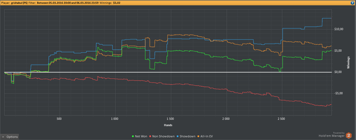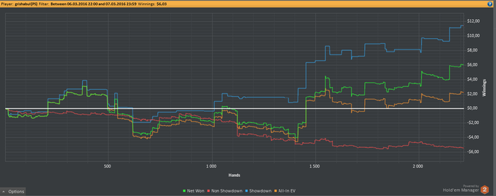 Final Pot: $5.79 Hero shows (a flush, King high) UTG+2 shows (two pair, Sevens and Sixes) MP2 shows (a straight, Five to Nine) Hero wins $0.62 Hero wins $4.97 (Rake: $0.20)