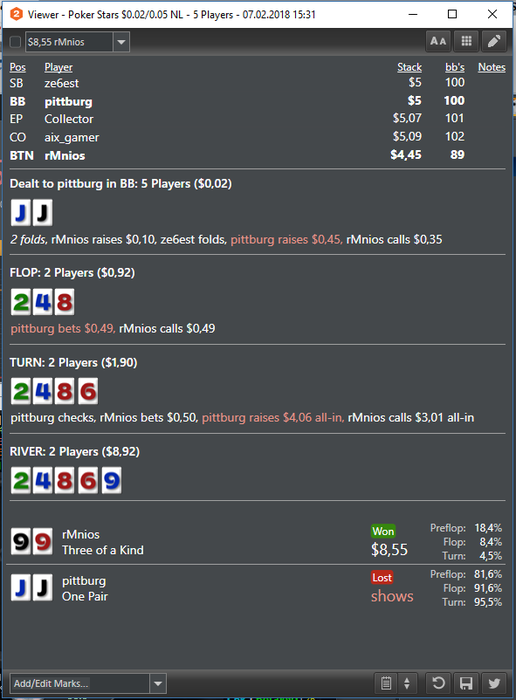 DEZ5566, имхо, хорошо сыграно, в 3БП там только дамы бьют и сет 88, при этом 99 и ТТ колят. АК хз как товарищ разыграет. Это даже против рега велью, даже без метки. Если там еще и A8s есть, а скорее всего именно так, то для нас около 60% эквити при пуше в этом споте.