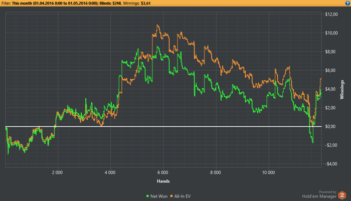Вот так вот пиздато я катнул фр столы Конечно дистанция маленькая,бывали значительно больше отрезки в ноль.По ощущениям до сих пор как-то туёво идет,оппы в 4бетпотах в сеты попадают,постоянно доски с 4-мя картами одной масти,когда у меня сет и т.д. Но желание катать фр у меня пропало,лол.Так что всё по новой Миша,все хуйня,обратно на сх,там хотя бы рб побольше))И рук в час больше и доллар в час.Хотя рылся в базе,у одного оппа,2722 руки в час на фр столах,походу 40 столов катает,дикий,и сука 20% попаданий в сет,пздц.И так заметил,что практически у каждого фиша процент попаданий в сет под двацатку...у меня 9%.Стыд.
