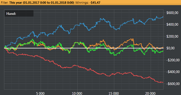 Были какие то мттшки, спины, катка с планшета, плюс ХМ врет. Накэшаутил за год 4,3 к. Будем считать это профитом. Ну чо, маловато конечно, но это лучший год карьеры. Планы на 2017? Не тильтовать. Стабильно отыграть на нл25, в прыжке на нл50 не уверен. Очень уж лузово там бывает, а по красной тянуть не умею. Учиться вряд ли буду. Ну а так всех с Новым Годом! Не тильтуйте, пацаны. Не переоценивайте ТПТК и оверпары. Делайте перекос в сторону вэлью, а не блефа. Все у вас получится
