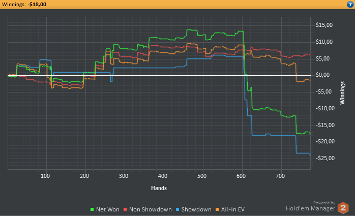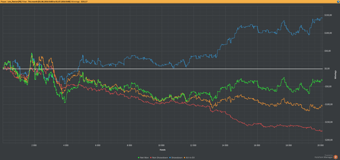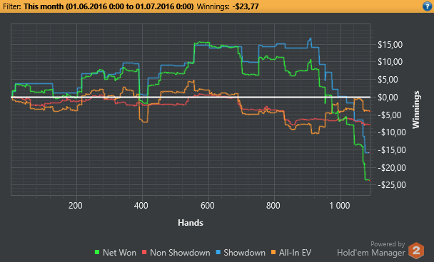 PLO 5. В начале месяца залез в минус, а все остальное время катаю почти что в 0. Наверное жизнь учит, потому что стал катать намного тайтовее, хотя тут у меня парадокс. Когда только начинал играть, то статы были 38/22/8 и играл в хороший +, а сейчас статы колебаются в пределах 22/16/6 и играю в 0.