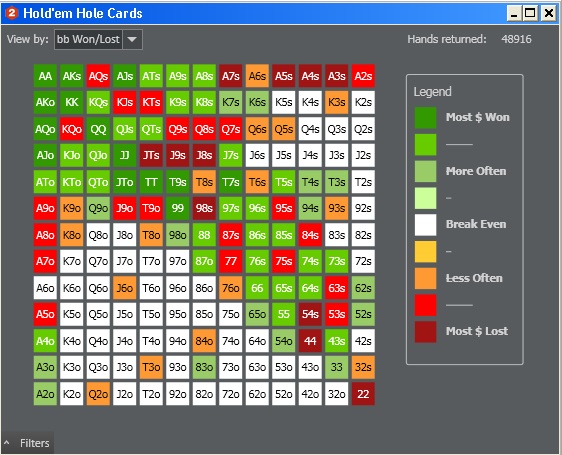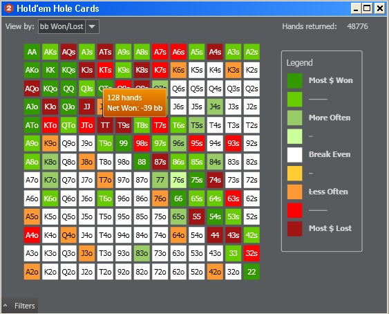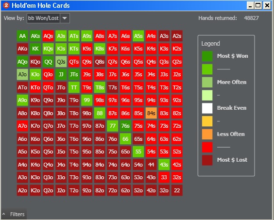 Но есть руки которые я играю в плюс с SB и они не входят в стартовый чарт, возможно просто выброс статистики или мне прет по ним. A5s +15bb (146 hands) K8s +20bb (170 hands) T8s +149bb (137 hands) A9o +42bb (471 hands)