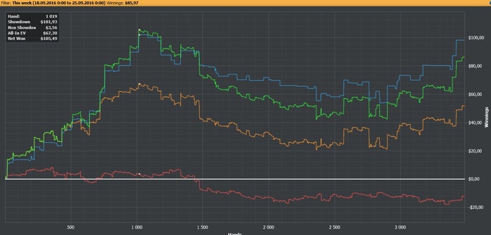 4. Если вышел в минус 2 стека во второй и последующих сессиях - выход по стоп лосу (кроме первой 1000 рук). Больше игры на сегодня нет. На вопрос почему такой маленький стоп лосс, отвечу, что мы просмотрели все сессии по графикам и заметили, что как правило двух переездов на стек оказывается достаточно для меня, что бы я поплыл и далее зарубил игру по черному. И как правило такое случается на второй сессии в 1000 рук.
