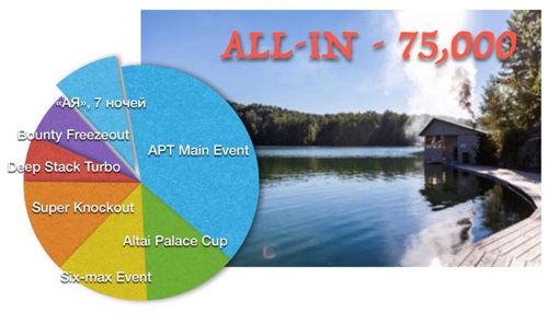 Пакет предусматривает пребывание с 14 по 21 августа и участие во всех основных турнирах серии: Bounty Freezeout (5,000), Deep Stack Turbo (5,000), Altai Palace Cup (10,000), Super Knockout (10,000), Main Event (30,000), 6-max Event (10,000). Сумма бай-инов - 70,000. Плюс - 7 ночей в коттедже "Ая"** за 10,500 5,000.