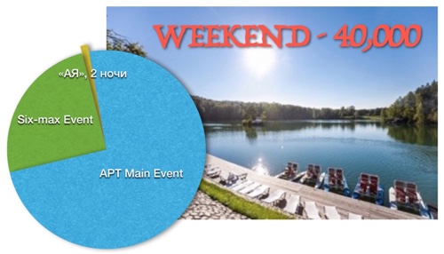 Пребывание с 19 по 21 августа, участие в Main Event (30,000) и 6-max (10,000). Сумма бай-инов - 40,000. Плюс - 2 ночи в коттедже "Ая" за 3,000 бесплатно.