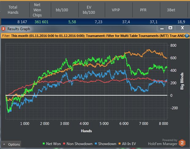 последняя сессия испортила общую картину ноября, играл вчера ужасно хоть и винрейт был в норме. по ЕВ +6,3бб/100 , по факту +7,3бб но не всегда в винрейте счастье,отыграл практически без ITM и получил просадку на -100 , а под конец сессии захотел отмазаться в снг и турбо мтснг $3,5-$7 но безуспешно в итоге ещё -50. во время сессии странное состояние было, не могу даже описать. какой-то не собранный был и мозг как-то лениво думал что ли... в общем ладно.. возможно пора обновить свои знания, только найти бы на это время, всегда ж хочется играть, а в выходной смотреть видео по покеру как-то не тянет. Надо в начале декабря пару заносов пусть даже мелких. а пока подобью итоги ноября.