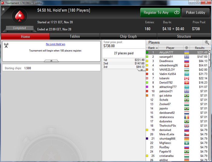 MetallistKh @ 17.12.2016 чуйка не подвела, знал что плюсану. правда не так как хотелось, но уже хоть что-то 3-е место в турнире the two, хотя должен был выигрывать. ошибка - переагрился в топ4. а так ещё было две предфиналки, на старзах за 3,3 и в голдфише. в итоге +126