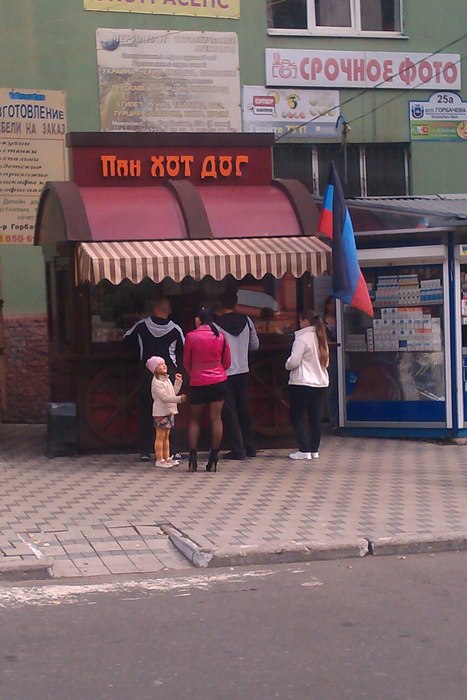 Как видно на последней фотке, по всему Донецку развешены флаги ДНР, так же названия некоторых учреждений отличаются от привычных, например: "Центральный республиканский банк", "Республиканская школа", "Республиканская больница". Много машин с номерными знаками DPR, как я потом узнал, они не могут выехать за пределы ДНР или Ростовской области. В целом, наверное как в любой стране, там заделывают цветами флага все что можно: Один мой покерный товарищ спрашивал как там атмосфера в городе, на самом деле там все точно так же как у нас в Украине: по городу ходят военные и иногда слышны выстрелы/взрывы (правда там чаще).