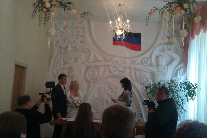Теперь касательно самой свадьбы, я почти не делал фоток потому что не хотел позориться среди фотографов со своим смартфономПоэтому только одна фотка из ЗАГса: Кстати говоря, рядом с ним находится здание ДК которое было взорвано украинскими военными, и на здании загса есть следы от осколков.