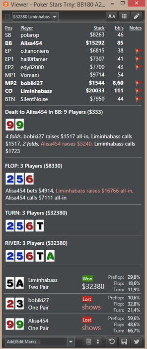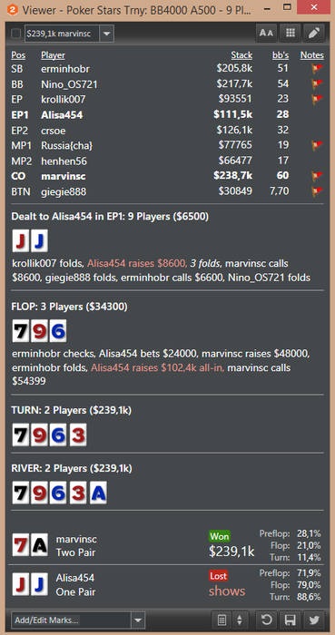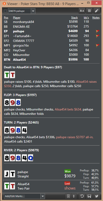 Тильтовал жутко переезды и свои некачественные действия сделали дело, но в итоге проигрывая мы учимся и получаем необходимый опыт, стимул для развития и для работы над своей игрой. Вот ниже 2 казалось бы похожие раздачи, в обеих оппы отморозилисть и по 2-й паре пихнули, думая, что выбьют меня из банка, но в обеих словили доппер и моя оверпара по флопу, на ривере оказалась ну как бы так ))). Но даже тут есть ошибки и над чем работать, с 99 сквиз д. Б. больше примерно 3х. так что работа над игрой и как Завещал В.И. учиться учиться и еще раз учиться !!! Всем удачи за столами.
