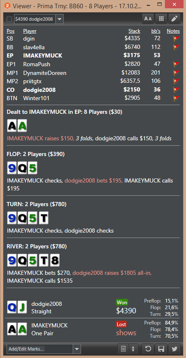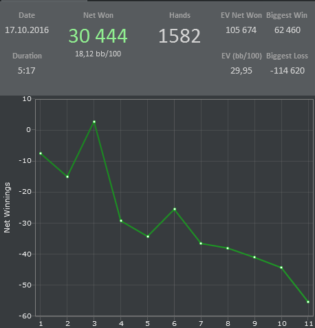 1) Раздача, есть сомнения по розыгрышу, но то, что опп пихал по фд+oesd ему по шансам, но он строго репил натс, а я решил, что натсы будет добирать спокойно, по такой доске и как раз выставился в монетку, но по факту нужно было фолдить. Вторая раздача с RS против фиша, ну тут я совсем отъехал, решил, что мне он репит флеш, а у меня блокер и т.д. и т.п, Забыл одно правило, фиши так не блефуют, они строго натсы по такой линии, гу и как бы стрита я не увидел, за что и был жестоко наказан ))) Ну и приятное давно такой +++ сессии не было по EV )) Да да, рук мало, но картинка приятная !!! ) Всем удачи GOOD NIGHT GOOD LUCK ну и чего еще там. На графике - 60 $, но там не учитываются баунти за оппов в ноке за 16/5 и 11 ББ.