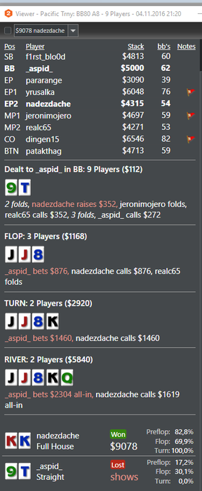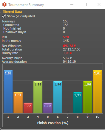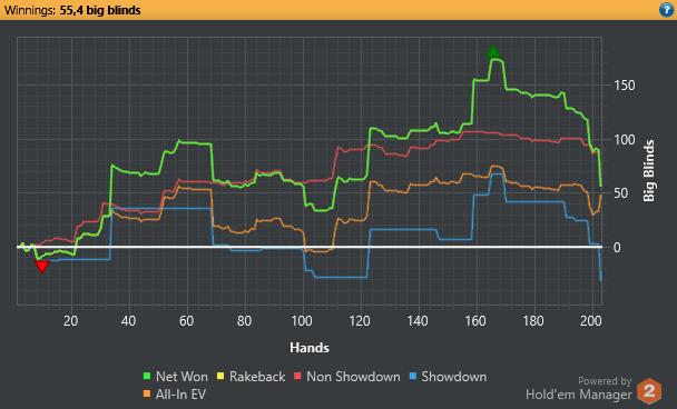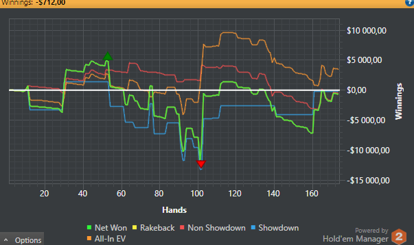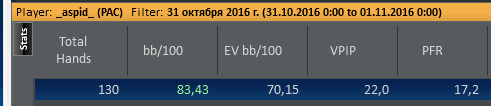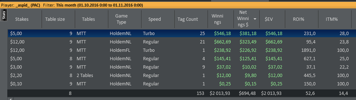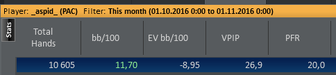 Решил подвести итоги за месяц. Статы мои мне не нравятся. Надо работать над дисциплиной, все проигрыши- это моя не правильная игра, а не оппу доехало.Чарты надо еще поразбирать. Стиль игры сложился больше как луз агрессивный,это не приговор, но но все же меня это не устраивает.Также, часто замечен как фиш), но на это есть объективные причины: с кем поведёшься, как говорится... Месяц вышел в плюс, но не считаю, что это оптимально. Работать надо меньше, играть больше)! Да, и EV надо увеличивать. Пару дней косячил, причём на ровном месте. Понимаю, вижу, но всё-равно коллирую). Бац, и вторая смена.