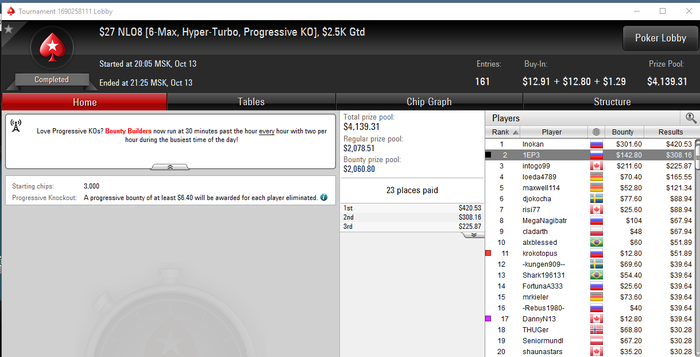 Premove10 @ 12.10.2016 Дождался вылета Фиша в 3макс и поделил с регом, отжав 50 баксов