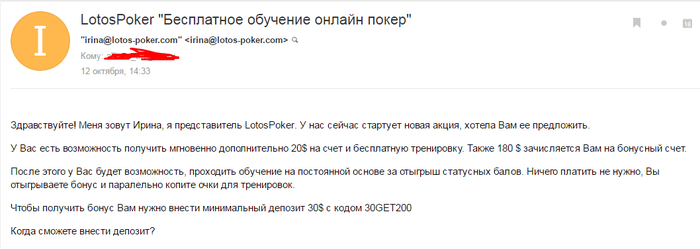 Вообще, стиль письма и оформление в стиле школьной работы по информатике у меня особого доверия не вызвали, но адрес, заканчивающийся на lotos-poker.com и призыв сделать депозит, а не положить 500 рублей на счет в киви-кошельке, дают основания думать, что это все же ваших рук дело. Или нет?
