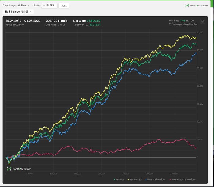 Всем привет. На дворе лето, а летом у меня постоянно меняется химия в голове и хочется сместить фокус с катки. Результаты(в х2н чутка криво сохраняет даты у меня) с мая-июня 2019 На графике 400-1k ибо на лимитах выше выборка не будет презентабельна из-за маленького количества рук и большой диспы + еще нету 100-150к рук в 10бб на пати(зум500-1к) Игра практиически без селекта. Тут все. Хедзапы, 3максы и тд и тп. Начну с ценника 500$/hour.