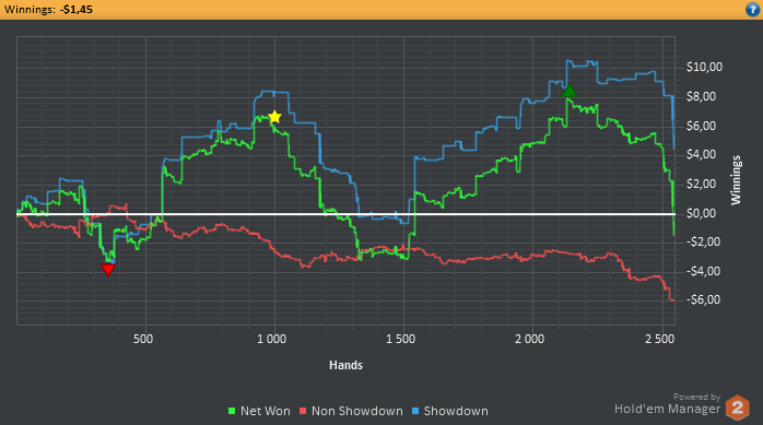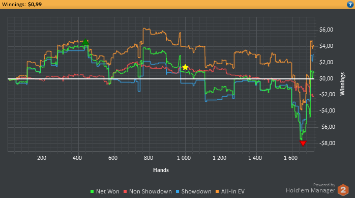 Всем привет!!! Припозднился с отчетом)) Но лучше поздно, чем никогда! Год в целом ок! Поправил здоровье! Избавился от вечного насморка) В игре подтянулся немного, наконец стал изучать софт) смотреть правильные вводы хороших игроков! Подтянул красную до ноля) но по-прежнему играю как кусок дерьма! Особенно стыдно, что на нл 10-25 практически не играю!!! Зато лудил зум 200 Сам не понимаю зачем я так делаю, в деньгах особо не нуждаюсь, но тем не менее по кой-то хер ежемесячно вывожу бабки! Вспомнилась история... Накупил я маек пс напялил одну))) иду в общем весь такой топрег подхожу к тачке, стоят два господина))) - о привет ты в покер играешь?! - привет, да! А вы тоже покеристы?! - ага мттшники! А ты?! - я играю нл 2)) Улыбатются))) подхожу к своей свеженькой камрюхе, делаю пик-пик))) Братан!!! А ты точно нл 2 играешь))) да! НАУЧИ)))))) Поржали вместе)))) и мне так стало стыдно! Что я такое днище нанолимитное... Вот поставил я себе цель в этом году выдрочить софт, убрать все Лики ( чтоб вы понимали какое я дно, у меня кол 3бета в минусе)))) и наконец рости по лимитам!!! Че бы там не было!!! Начну с нл 2 тк бр 19 дол! Постараюсь закрепиться в капах! Если сложится продолжу их катать! А главное никаких кешаутов!!!! Никаких бля! Ты понял да!!!!! В Офе плюс значительно больше))) все от того что я прихуячил парня с нереальным эго в ха! Обул его на 1 к дол. Ещё столько же заторчал под карандаш! Ну и ещё я в этом году полон идей и энергии развиваться в бизнесе! Очень хочется какого-то фьюжена) нового проекта! Под это дело приобрёл коммерческое помещение, правда торчу за него немного, но это все хуйня! Не самый мой большой кредит в этой жизни! Так что справлюсь!!! Как говориться не привыкать))) Хочется написать ещё кучу всего, но жена задергала))) Так что на этом ограничусь пожелав всем вам удачи мои дорогие читатели моего бреда!))))